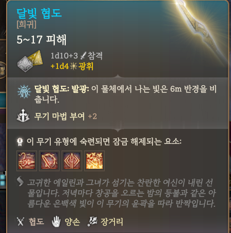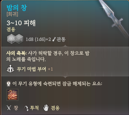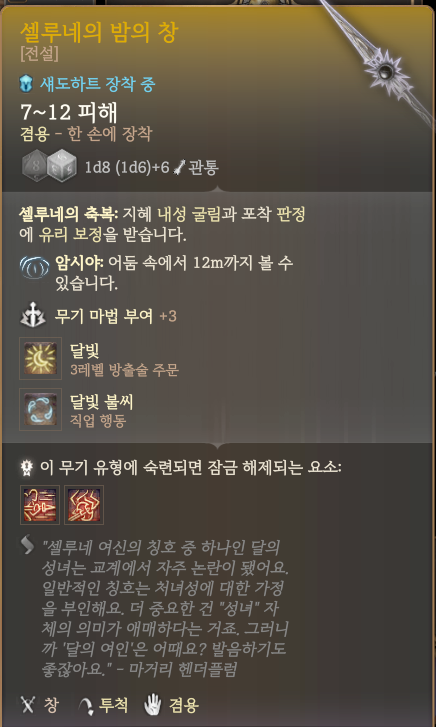 셀루네의 밤의 창은 바로 받는 것은 아니지만 밤의 노래[에일린]에게 곧 받을 수 있는 전설 등급의 무기이다. 지혜 내성 구림과 포착 판정에 유리 보정을 주며, 달빛을 사용할 수 있는 무기이다.