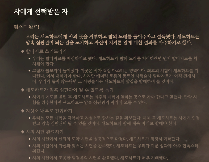 샤에게 선택받은 자 퀘스트는 섀도하트의 동료 퀘스트인 어둠의 딸의 하위 퀘스트이다. 해당 퀘스트를 어떻게 클리어 하냐에 따라 스토리에 꽤 영향을 미치게 된다.