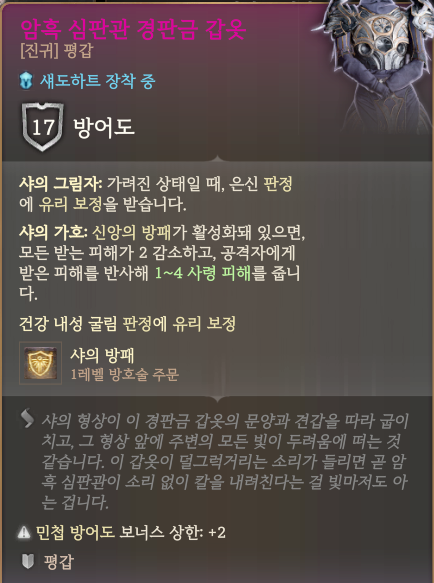 2막 그림자 저주가 물든 땅을 탐험하다 보면 후반부에 샤의 시련에 가게 된다. 섀도하트와 샤의 시련에서 각종 시련을 클리어 하면 섀도하트가 암흑 심판관이 되는 길에 가까워지는 듯 해서 기뻐하는 모습을 볼 수 있다.