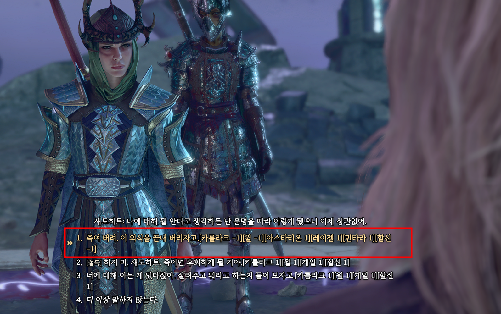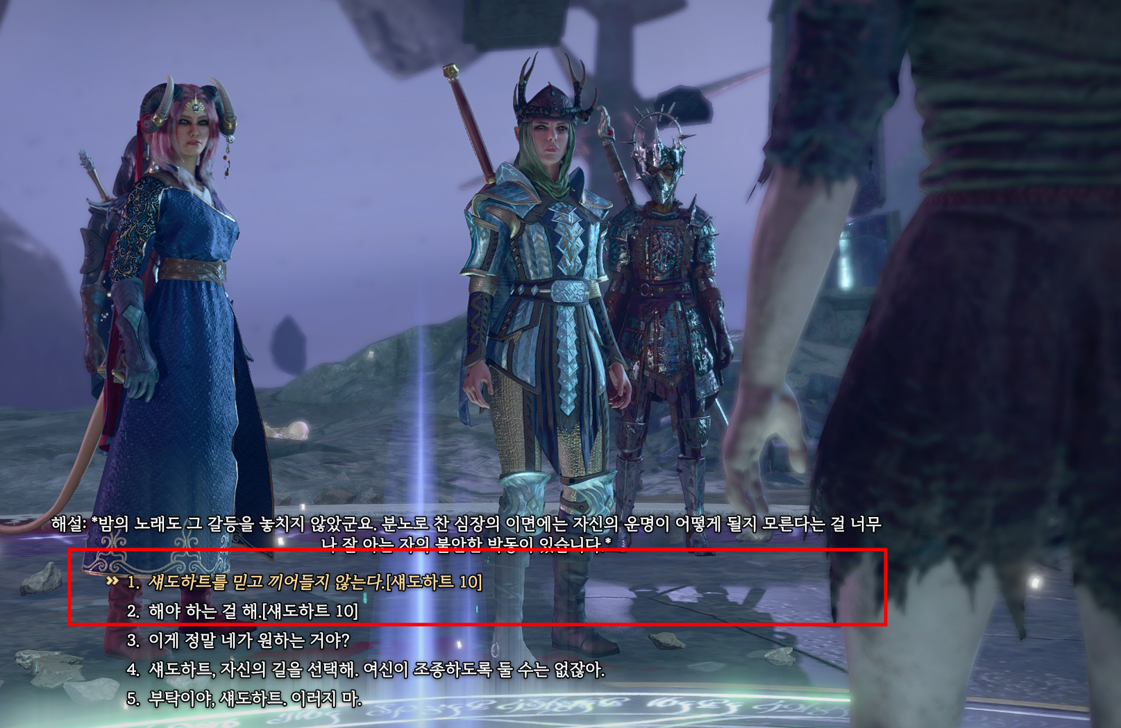 또한 밤의 노래가 죽지 않았으니 3막에서 특정 퀘스트를 통해 최종 전투에서 임시 동료로 활용할 수 있으니 참고하자.