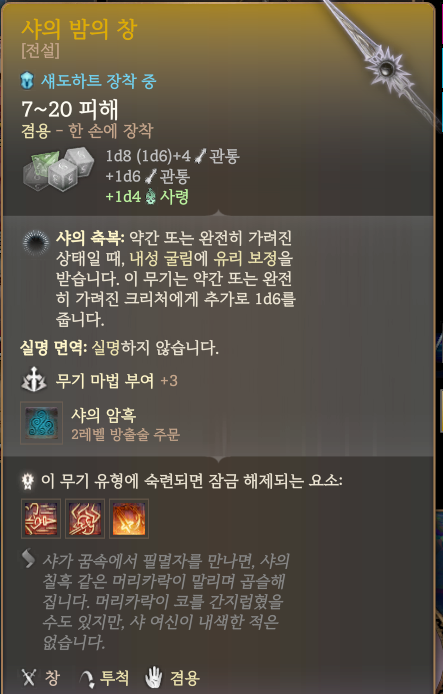 전설 등급의 샤의 밤의 창 및 암흑 심판관 장비들을 얻게 된다. 샤의 밤의 창은 상당히 좋은 무기 중 하나로 생존력 및 딜까지 우수하게 뽑아내는 무기이다.