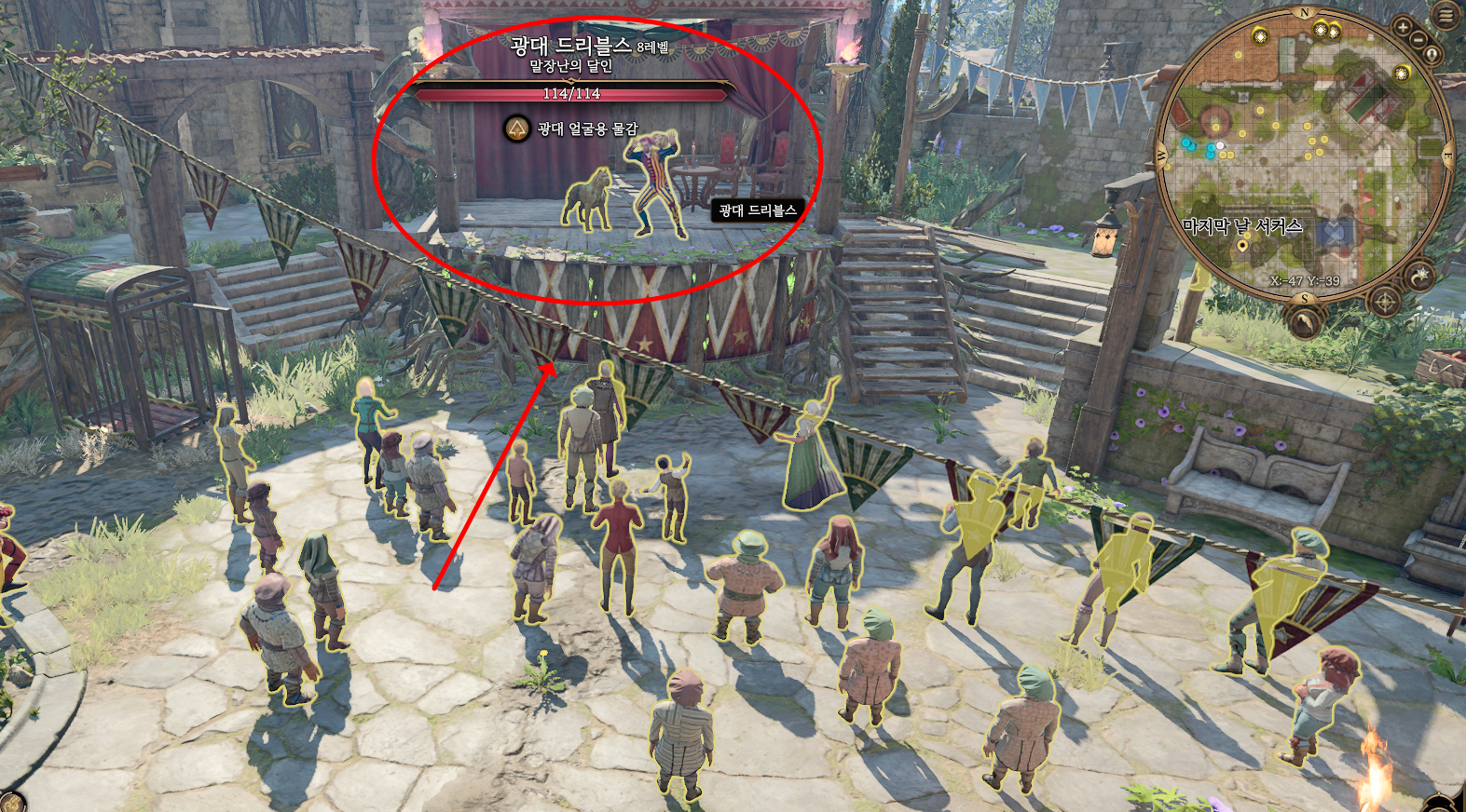 그러면 광대 드리블스가 공연을 하고 있을 텐데, 다가가면 자동으로 대화가 시작된다. 그러면서 캐릭터 한 명을 무대 위로 올라가게 유도하는데, 가든 안 가든 상관없다.