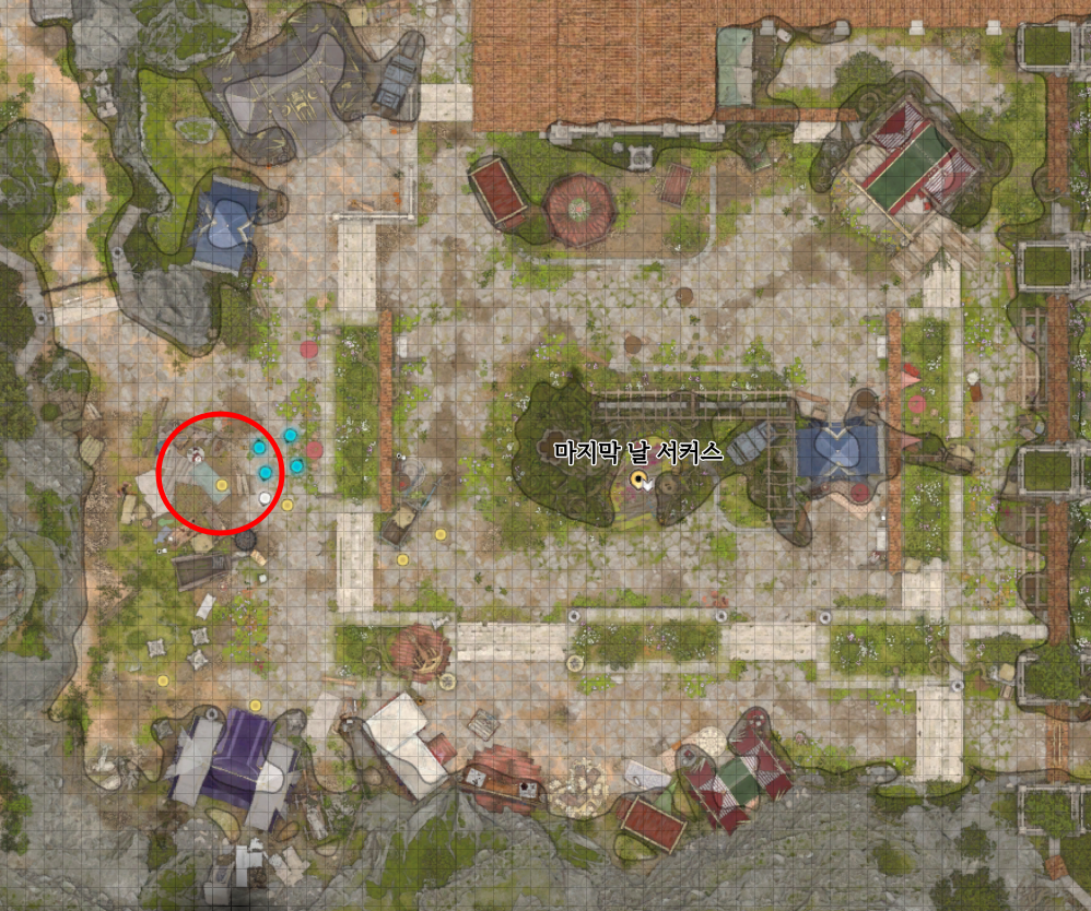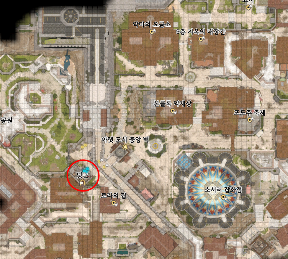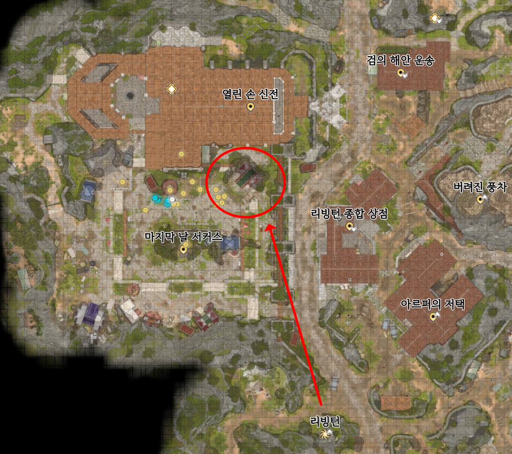 발더스3 마지막 날 서커스 3막 리빙턴에 있는 마지막 날 서커스 지역은 작지만 상당히 알찬 공간이다. 상당히 많은 상인들이 있고, 니룰나라는 전설 무기나 주문력 장갑 같이 유용한 아이템들을