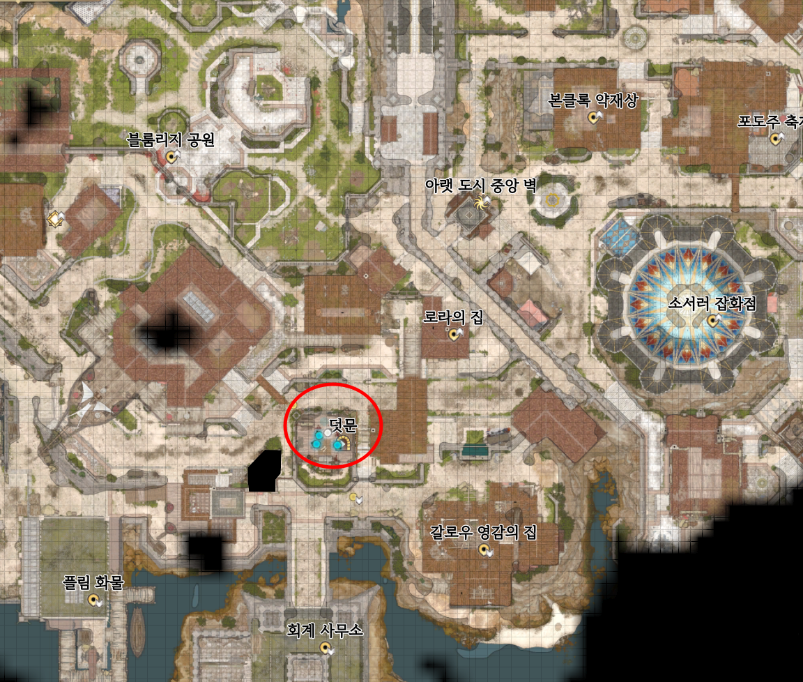 아랫 도시 중앙 벽 순간이동진 근처에 라버니카의 집[X -76, Y -69]이 있다.