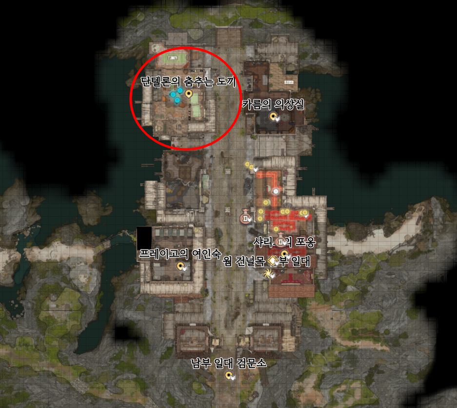 단텔론의 춤추는 도끼의 위치는 웜 건널목 왼쪽 위에 있고 건물 기준으로는 2층에 있다.