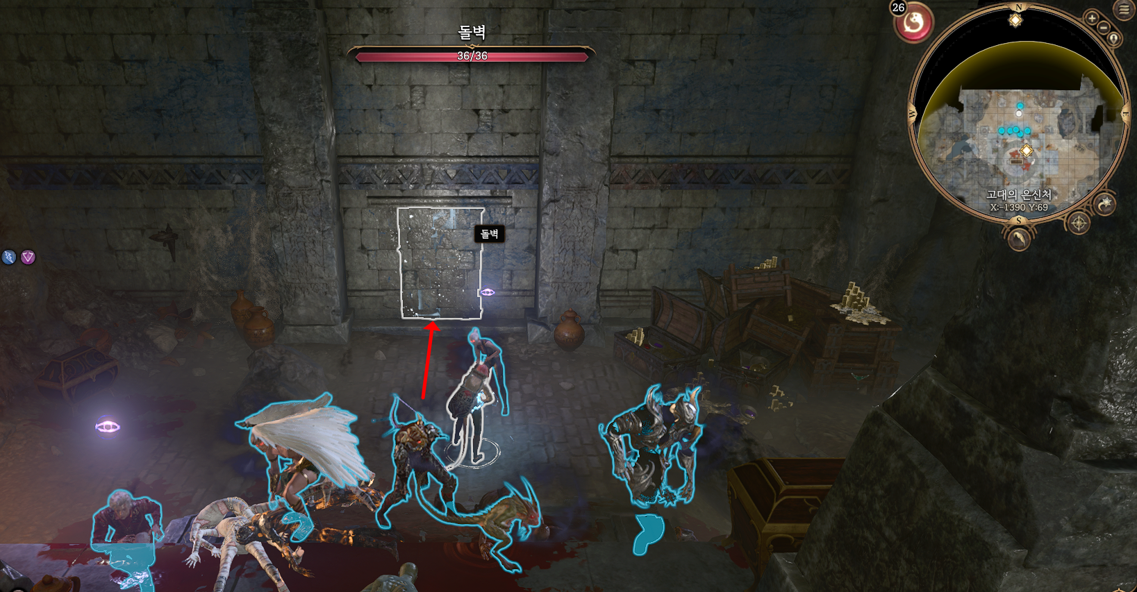 전투가 끝난 후 보물 상자 더미와 궤짝에서 금화 파밍하고, 중앙에 있는 돌파의 장창봉까지 파밍했다면 고대의 은신처 북쪽에 있는 돌벽을 포착해서 부수고 들어가자.