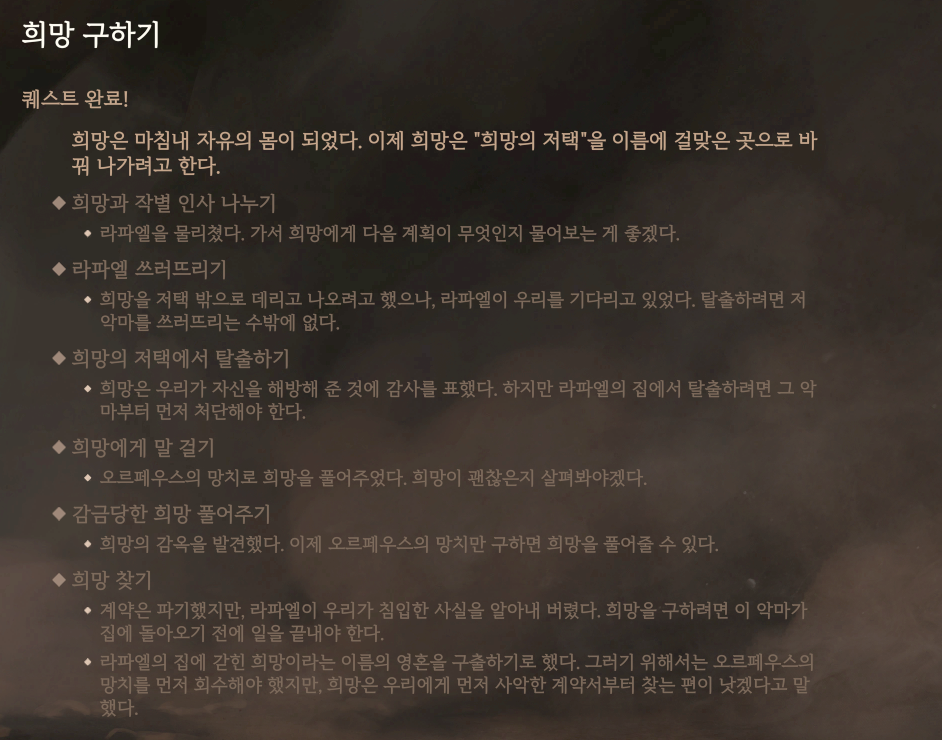 3막 아랫 도시에 있는 악마의 요금소에서 재료를 바치고 희망의 저택에 들어왔을 경우에 발생되는 퀘스트이다. 정확히는 이 희망의 저택에 있는 희망이라는 영혼이 구해달라고 요청할 텐데 승낙할 경우에 시작된다.