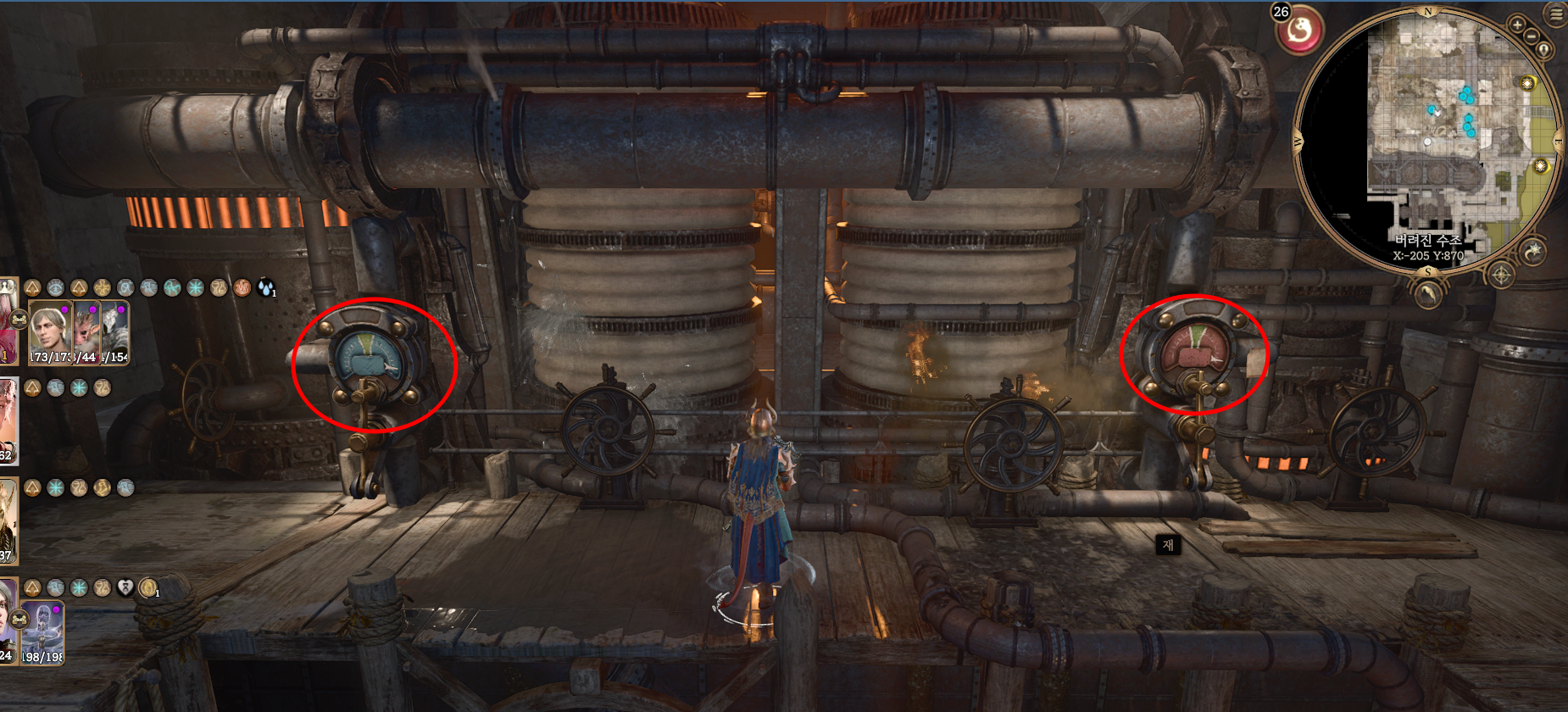 보통 공략을 모르고 먼저 건드리는 유저들이 있을 텐데, 이럴 경우에는 두개 모두 과열, 넘침 상태가 될 때까지 기다리자. 이 상태가 되면 오른쪽에 있는 긴급 방출 개폐기만 누르고 기다리면 자동으로 수조가 열린다.