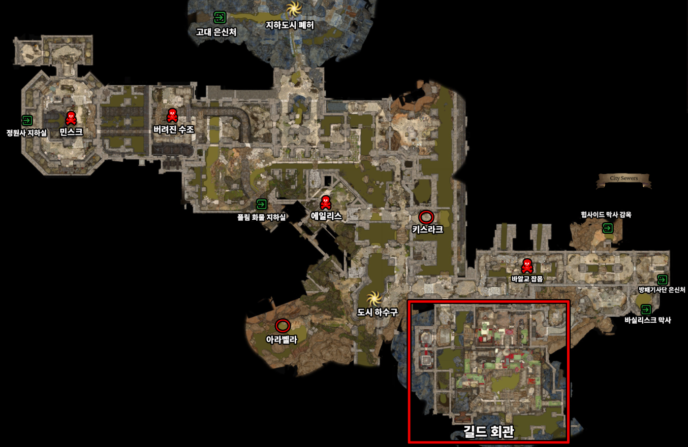 하수구를 가는 방법은 정말 너무 많고, 어디로든 진입해도 모두 이어져 있어서 대표적인 1개의 입구만 알면 된다. 바실리스크 게이트 바로 위에 있는 맨홀로 진입하면 된다.