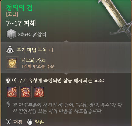 무기 : 정의의 검 → 요고랄의 대검. 3레벨에 얻는 계약 무기 결속을 이용해서 계약 무기로 사용하면 된다.