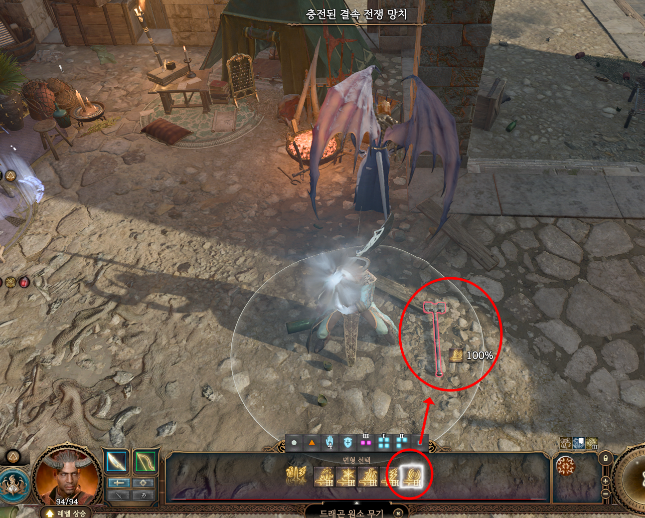 사용하는 방법은 ⓐ충전된 결속 전쟁 망치를 땅에 떨어트리기 → ⓑ 드레이크식 식도 협도 착용 후 드래곤 원소 무기 스킬을 땅에 떨어진 전쟁 망치에게 사용하기 → ⓒ 전쟁 망치 착용 후 계약 결속하면 끝.