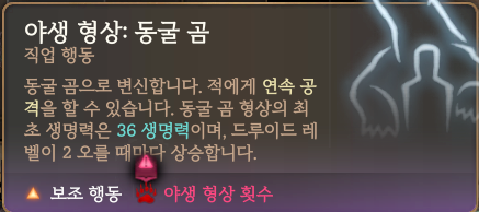 2레벨 : 동굴 곰 변신하기. 인간일 때 활보 미리 걸어두고, 전투 때 얼음 칼 사용 후 변신해서 싸우면 끝. 곰 자체가 초반에 엄청 강한 편이다.