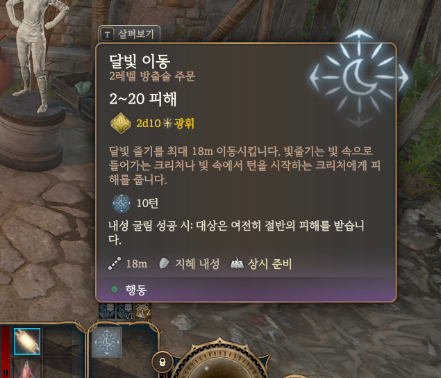 3레벨 : 2레벨 주문[달빛] 사용 후 오른쪽 아래에 생기는 달빛 이동 사용하기. 10턴동안 사용할 수 있어서 사실상 그 전투가 끝날 때까지 강력한 딜을 유지할 수 있다.