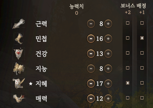 드루이드 직업을 주인공 캐릭터로 활용할 것이며, 에텔의 머리털을 지혜에 줄 계획이라면 근력 8, 민첩 16, 건강 13, 지능 8, 지혜 17, 매력 12에 투자 해보자.