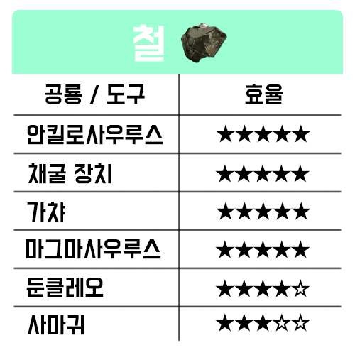 파밍 방법 : 초반에는 곡괭이로 바위를 부수면 많이 얻을 수 있으며 그 후에는 안킬로사우루스를 통해 바위를 부수면 고효율로 얻을 있습니다. 철광석 부시면 안나오니 일반 바위만 캐세요.
