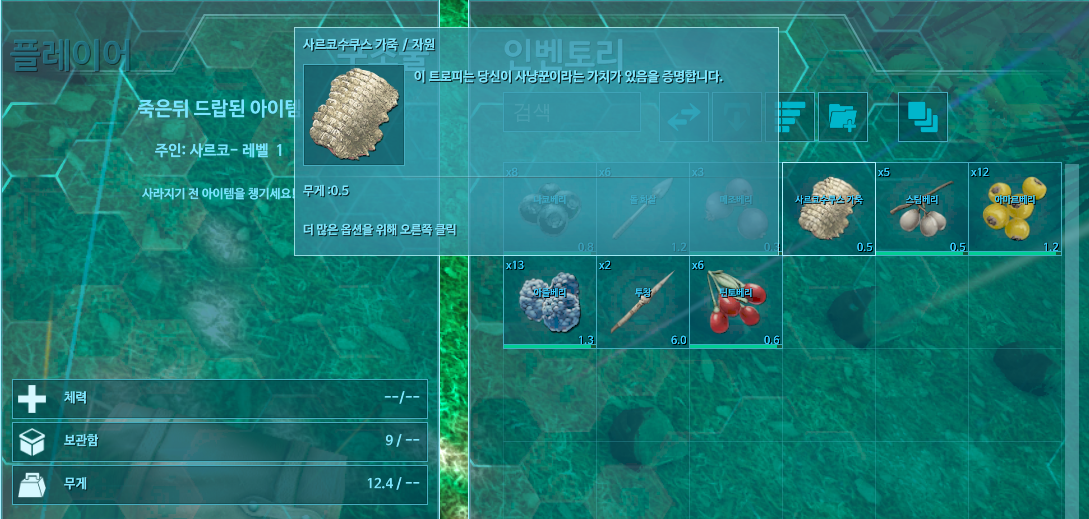 유물은 동굴에서 가져오면 되며 특정 재료는 이름이 써져 있는 해당 공룡을 잡아서 인벤토리를 확인하면 획득할 수 있습니다.