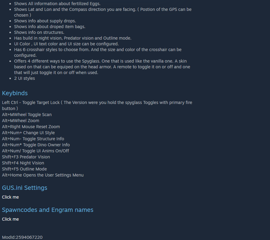 아크 시작하자마자 사용 했던 모드인 AWESOME SPLYGLASS입니다. 생물의 체력, 스탯, 먹이 등을 한눈에 파악할 수 있는 편의성 모드입니다. 창작 마당에서 구독 가능하고 서버 매니저에 등록할 Mode ID는