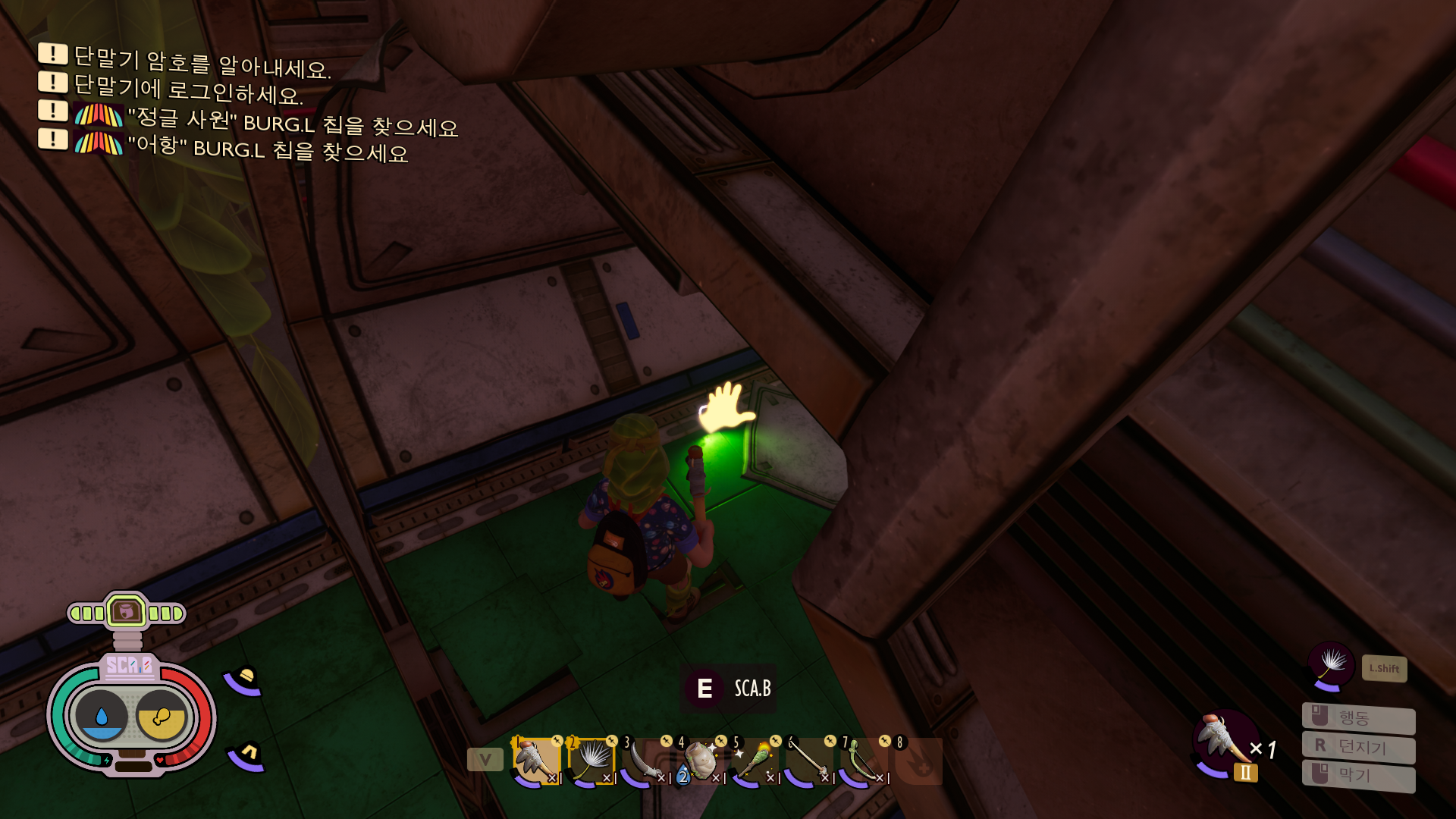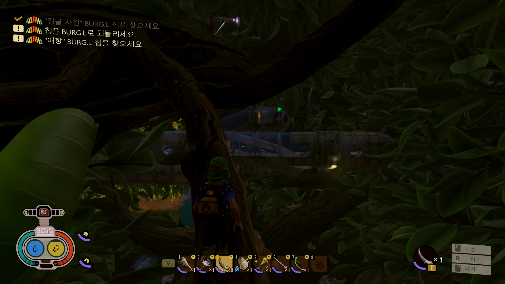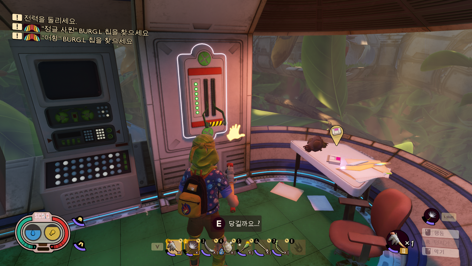 칩 회수하고 로봇한테 가면 과학 원료로 여러가지 컨텐츠를 해제할 수 있습니다. 집라인, 사다리, 요리책 : 생울타리[거미 미니버거,라바냐], 저돌적인 성격, 신호 세트: 까마귀가 해제 됩니다.