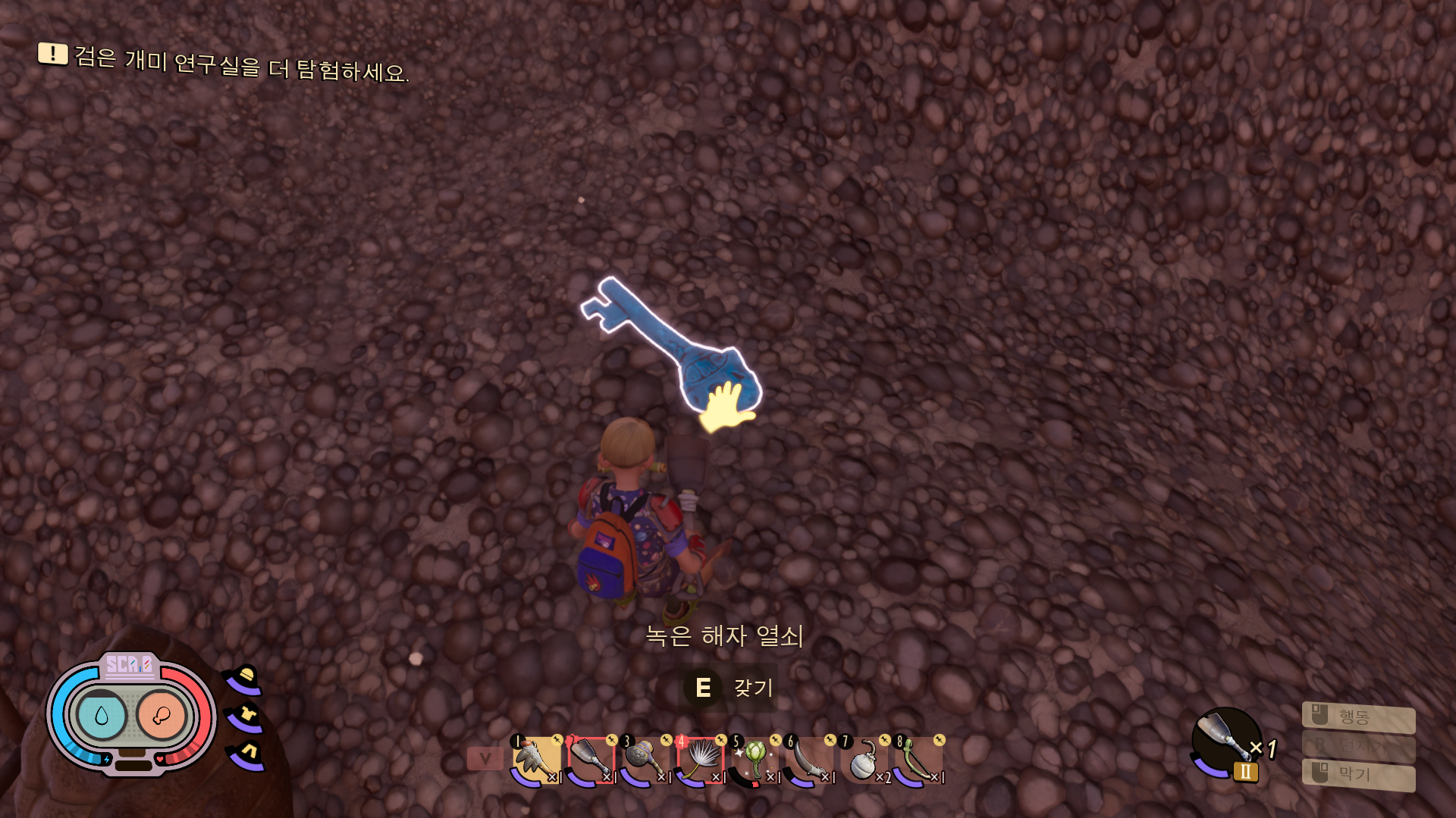 그 부분을 삽으로 뜨면 되는데 2티어 검은 개미 삽으로 팔 수 있습니다. 열심히 파다 보면 매장된 보물이 점점 드러나게 되고 녹은 해자 열쇠가 나오게 되죠.