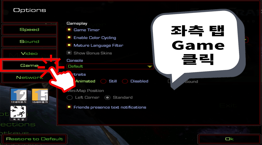 2. Options를 들어오면 왼쪽에 5가지 탭[Speed, Sound, Video, Game, Network]이 있다. 우리가 한글을 설정하기 위해서는 Game 탭에 들어가면 된다.