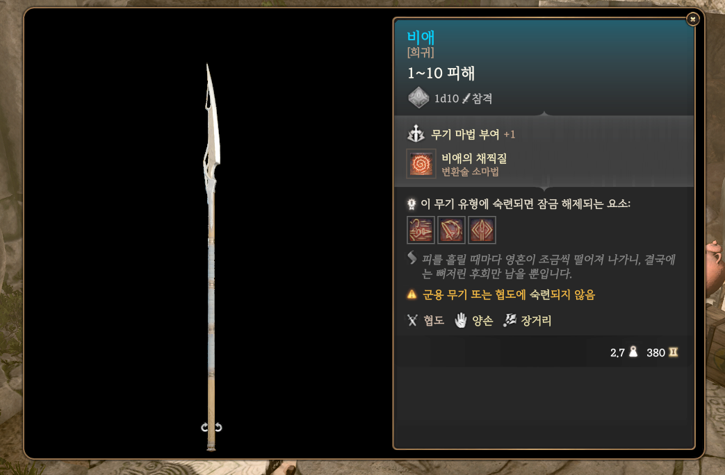 비애는 희귀 무기로 추가 행동으로 비애의 채찍질을 사용할 수 있는데, 나름 유용하다. 그러니 섀도하트 같은 애들한테 주면 유용하게 사용할 수 있다.