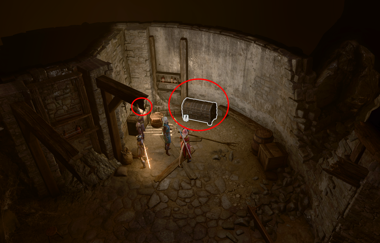정면으로 모든 고블린을 제거하기가 까다롭다면 유리한 포지션을 잡고 은신 공격을 통해 선턴을 잡고 시작하자. 대화를 하는 캐릭터는 좌측 하단에 있는 캐릭터 선택창을 누르고 다른 캐릭터를 선택해서 포지션을 잡으면 된다.