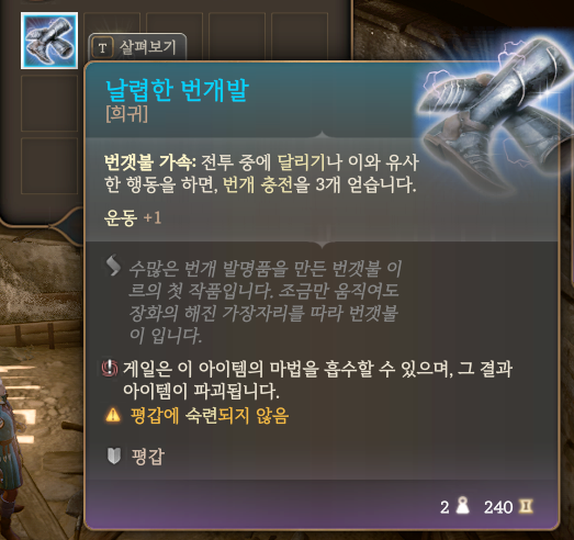 무거운 궤짝 안에는 날렵한 번개발이라는 희귀 아이템이 있다. 날렵한 번개발은 전투 중에 달리기 같은 행동을 하면 번개 충전을 3개 얻는 효과를 가지고 있다.