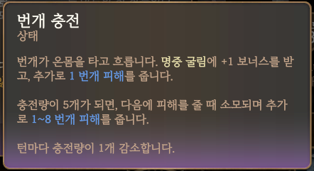 번개 충전은 명중 굴림과 추가 피해를 주기 때문에 나름 유용한 아이템인데, 나중에 이와 비슷한 아이템들이 나와서 세트 아이템처럼 사용하면 시너지가 꽤 괜찮다.