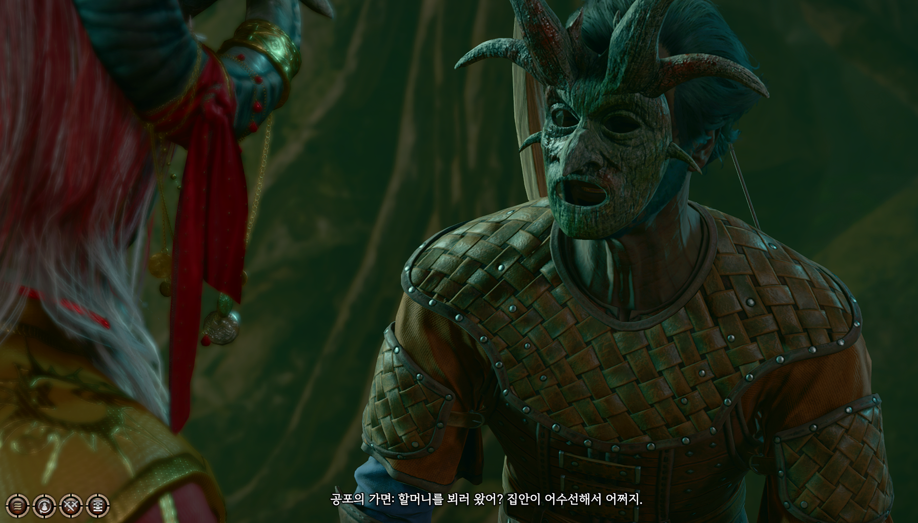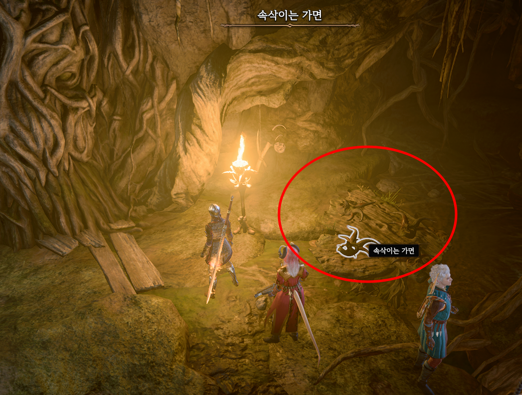 다른 방법도 있는데 문 앞에 있는 속삭이는 가면을 착용하는 방법이다. 1명만 착용해도 모두 문을 통과할 수 있는데, 다만 내성 굴림에 실패하면 혼란 상태에 빠져 아군을 공격하게 되니 문을 통과하고 바로 벗기거나 죽여서 되살려야 한다.