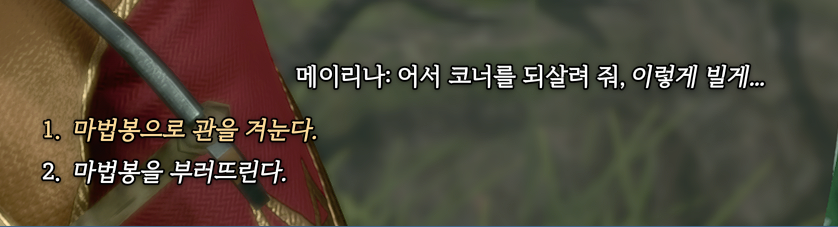 그런 뒤 마법봉으로 관을 겨누면 남편이 시체로 되살아나는데, 이 마법봉을 넘기면 메이리나가 남편과 같이 발더스 게이트로 떠난다. 이제 메이리나는 3막에서 보면 된다.