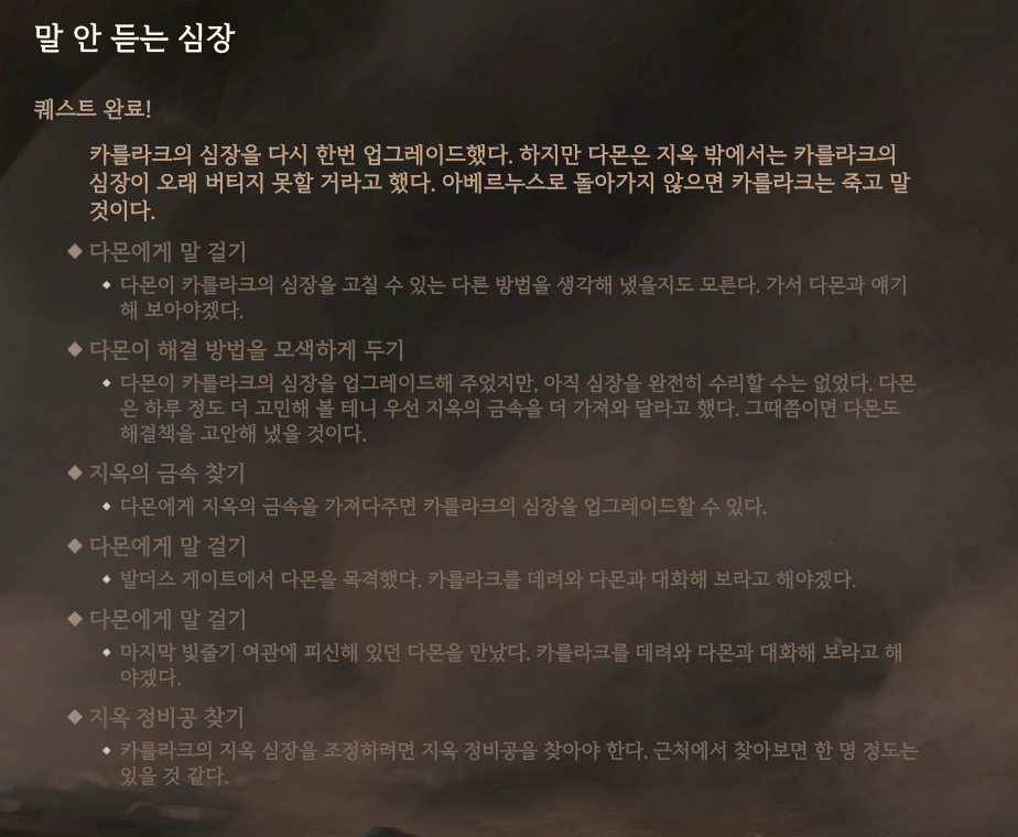 1막 ~ 3막 어디든 상관 없이 카를라크를 동료로 영입하고 대화를 하면 다몬과 카를라크가 서로를 알아본다. 그 후 지옥 심장을 고칠 재료가 필요하다는데, 정확히는 지옥의 금속이 필요하다.
