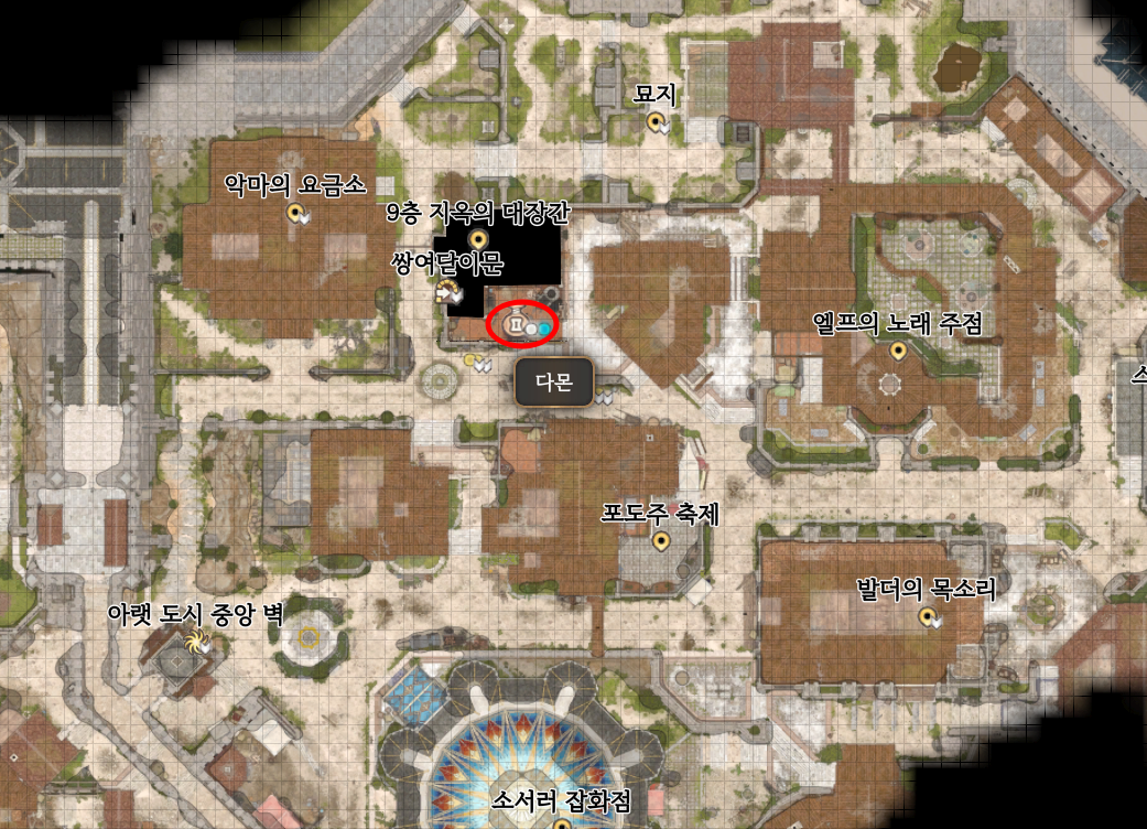 다몬의 1막 위치는 에메랄드 숲 동굴에 있고, 2막은 마지막 빛줄기 여관, 3막은 아랫 도시의 지옥의 대장간에 있다.