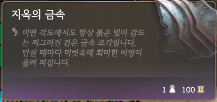 지옥의 금속은 1막에서 4개, 2막에서는 2개를 얻어서 얻기 어려운 아이템처럼 보이지만, 3막에서는 강철 감시자에게 얻을 수 있기 때문에 3막에서는 흔하게 얻을 수 있는 아이템이다.