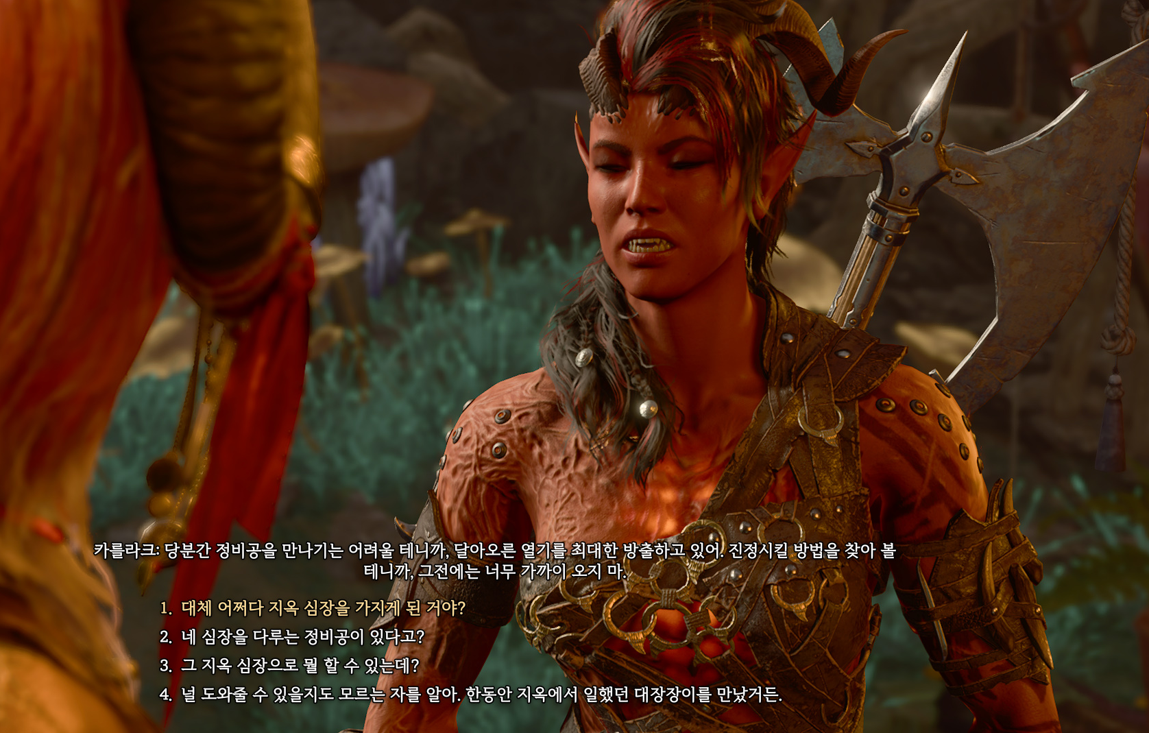 1막에서 영입할 수 있는 동료인 카를라크에게 말을 걸면 달아오르는 지옥 심장을 정비할 정비공이 필요하고 한다. 이 정비공은 티플링 종족의 다몬이라는 대장장이이다.