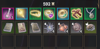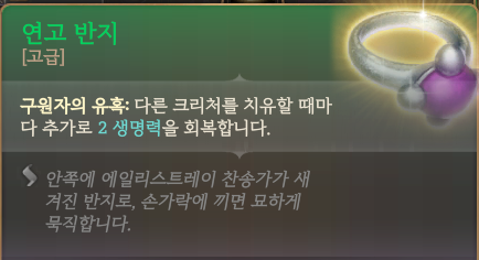 그 중에서 연고 반지와 힘의 진주 애뮬릿이 사용하기 편하고 좋은 편이다. 진줏빛 회복은 주문 슬롯을 회복하는 목걸이이니 초반부터 꽤 유용한 목걸이라 할 수 있다.