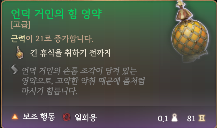 언덕 거인의 힘 영약도 판매하고 있으니, 긴휴식 또는 레벨업마다 구매해서 저축해놓으면 빌드에 따라 엄청난 시너지 효과를 발휘할 수 있으니 참고하자.